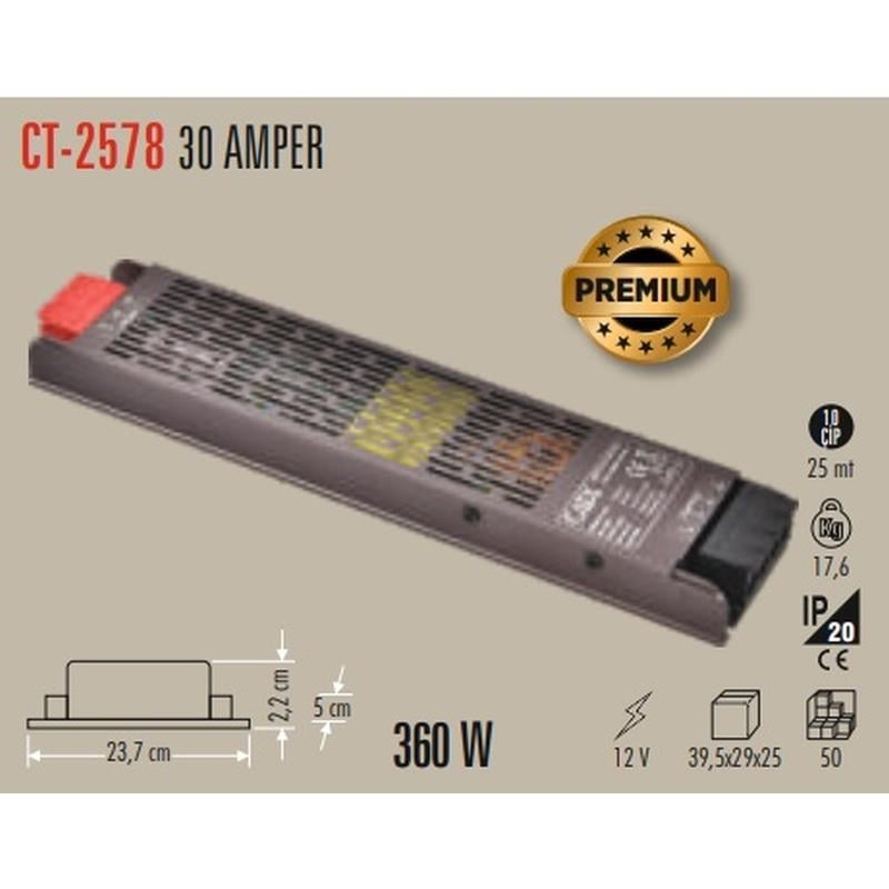 CATA CT-2578 12V 30A 360W Slim-Fansız Şerit LED Trafo, güçlü performans ve sessiz çalışma ihtiyacına özel olarak tasarlanmıştır. 30 amper çıkış gücüyle geniş LED sistemleri, tabela aydınlatmaları ve endüstriyel uygulamalar için mükemmel bir enerji kaynağı sunar. Slim kasası sayesinde yer kaplamaz; fansız yapısı ile tamamen sessizdir.